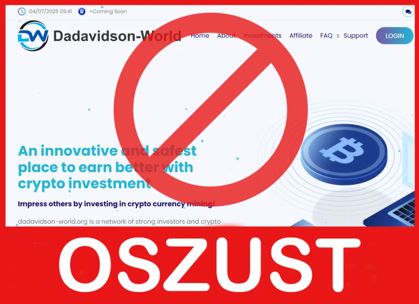 Dadavidson-World to klasyczny przykład oszukańczego brokera działającego bez licencji i regulacji, stosującego oszukańcze schematy i psychologiczną presję, by przyciągnąć i zatrzymać środki klientów. Brak przejrzystości, fałszywe dane, blokowanie wypłat i agresywne wymuszanie dodatkowych inwestycji to główne cechy tego projektu.