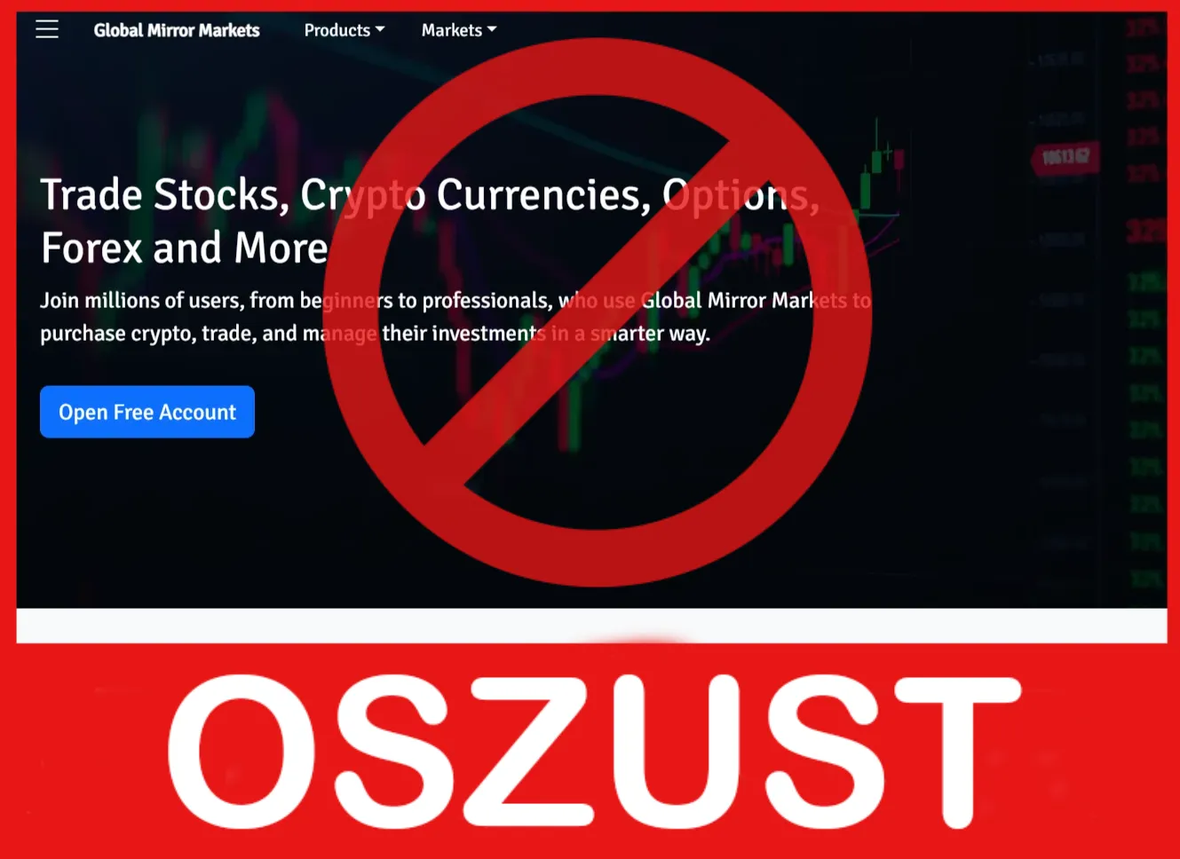 Global Mirror Markets to typowy oszukańczy broker, wykorzystujący sprawdzone schematy wyłudzania pieniędzy od inwestorów. Jego działalność charakteryzuje się brakiem licencji, agresywnym angażowaniem klientów, manipulacjami na platformach handlowych i odmową wypłaty środków. Tysiące poszkodowanych na całym świecie już poniosło straty przez zaufanie tej firmie.